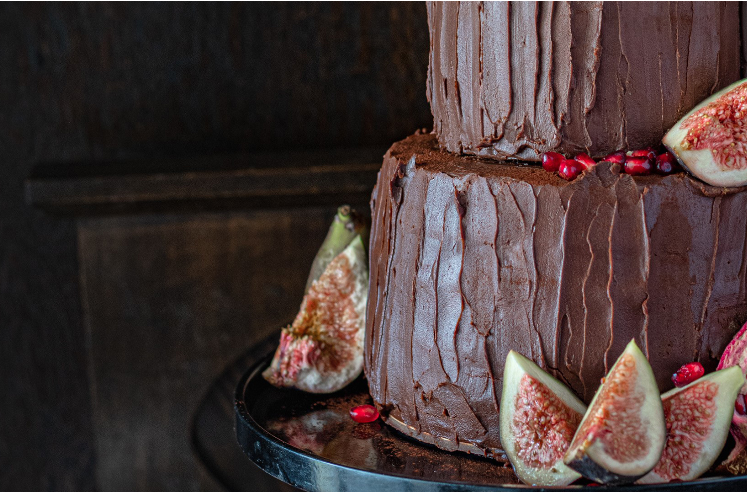 Note: The sponge and the figs can be prepared the day before. Make the ganache the morning of assembly, followed by the macaroon layers and buttercream.