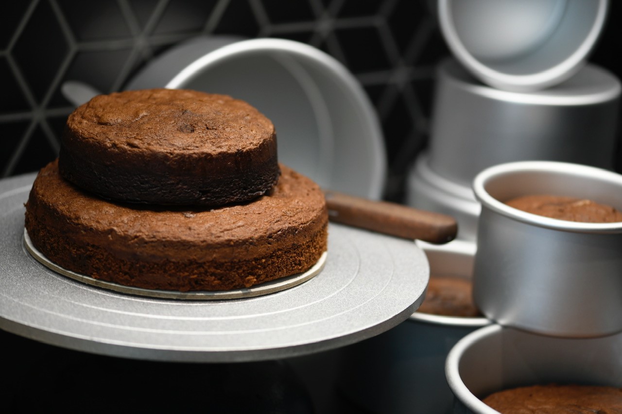- Grease tins and line the bottom with greaseproof paper. Dust the sides with cocoa and tap off any excess.